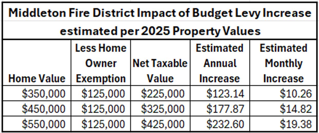 In an effort to achieve operational goals for fire and emergency medical services throughout the community, the Middleton Rural Fire District (MRFD) Board approved a resolution to place a levy increase on the November 4th ballot. The levy increase, subject to approval by 66.67% of voters, would add $2,225,000 to the District’s annual operating budget.